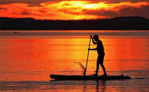 Fast wie ein Scherenschnitt wirkt diese Aufnahme eines Stand-up-Paddlers, die OVB-Fotograf Sepp Niederbuchner jetzt am Chiemsee in der Nähe des Campingplatzes Chieming gemacht hat. Der junger Mann nutzte den lauen Abend, um auf dem Bayerischen Meer seine Bahnen zu ziehen. Ein Unterfangen, das in den