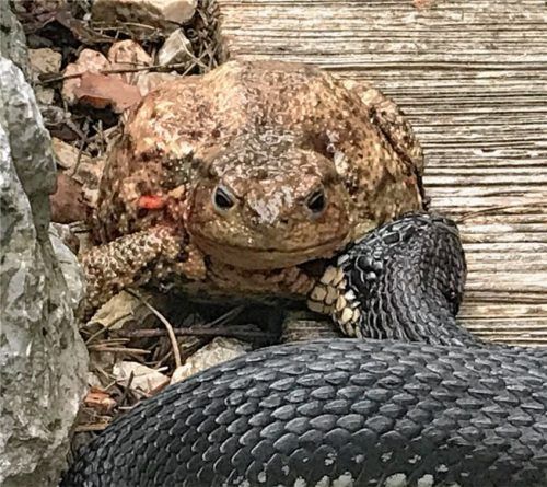Eine stattliche Schlange versuchte jetzt auf der Terrasse der Leser-Reporterin Claudia Pfurtscheller aus Litzldorf bei Bad Feilnbach, eine ebenso stattliche Kröte zum Abendessen zu verspeisen. Ein Bein steckte schon im Schlangenmaul. Als die Schlange mit einem Besenstiel vertrieben wurde, verpasste