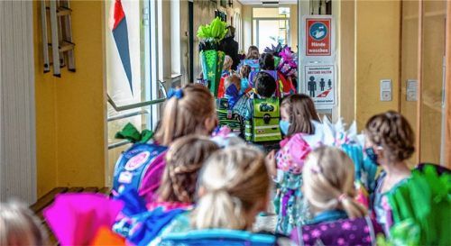 Landkreisweit eroberten gestern Hunderte Abc-Schützen – wie hier in der Grundschule Stephanskirchen – erstmals die Schulhäuser. Dabei war alles anders als sonst. Der Schulstart erfolgte unter strengen Corona-Auflagen und in mehreren Gruppen. Masken mussten dabei in den Grundschulen bis zum Klassenzi