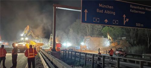 Die Brücke des „Filzenwegs“ über die Autobahn zwischen Nicklheim in der Gemeinde Raubling und den südlichen Rosenheimer Stadtteilen ist Geschichte. Sie wurde in der Nacht zum Sonntag von Spezialisten mit gut einem Dutzend schwerer Baumaschinen mit Meißel und Abbruchzangen abgerissen. Eine gewaltige