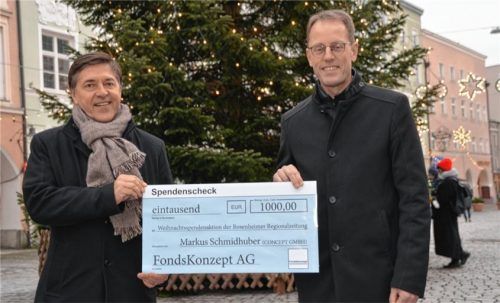 „Unser Daumendrücken hat geholfen“, freuten sich Markus Schmidhuber (rechts) und Karl Grießer von der Rosenheimer Concept GmbH, als sie mit einem Scheck in Höhe von 1000 Euro der Fondskonzept Investmentmakler GmbH mit Firmensitz in Illertissen ins OVB-Medienhaus kamen. Die beiden Rosenheimer Vermöge