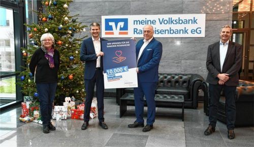 Die Stiftung der VR Bank Rosenheim-Chiemsee unterstützt die Tafeln in Bruckmühl, Kolbermoor, Rosenheim und Wasserburg der Diakonie Rosenheim mit einer Spende von 10000 Euro. Zur Übergabe des symbolischen Schecks trafen sich jetzt (von links) Elisabeth Bartl, Leiterin der Tafel Rosenheim, Stiftungsvo