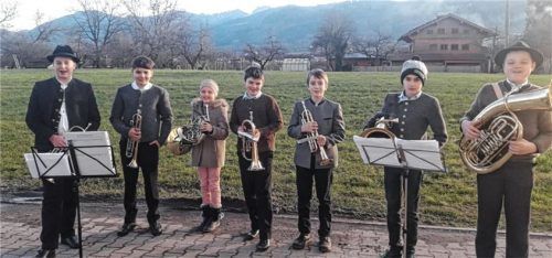 Die Jungen Auer Bläser, bestehend aus (von links) Johannes Hemeter, Marinus Fuchs, Magdalena Gasteiger, Leonhard Rauscher, Christoph Pauls, Johannes Fuchs und Vitus Gasteiger, hatten eine großartige Idee: Weil es aktuell keine Termine gibt, wofür es sich lohnen würde, fleißig zu üben, haben sie kurz