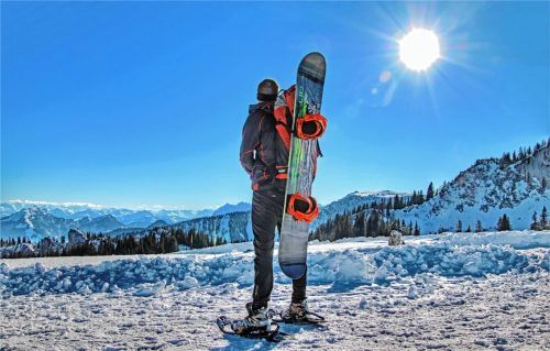 Vollbepackt ist dieser Wintersportler auf dem Aschauer Hausberg, der Kampenwand, unterwegs. In 1500 Metern Höhe bietet sich ein traumhafter Blick auf die dick mit Schnee bedeckten Bergspitzen der Zentralalpen. Nach dem Aufstieg geht es dann per Snowboard in Richtung Tal. Und wem der Weg auf die Kamp