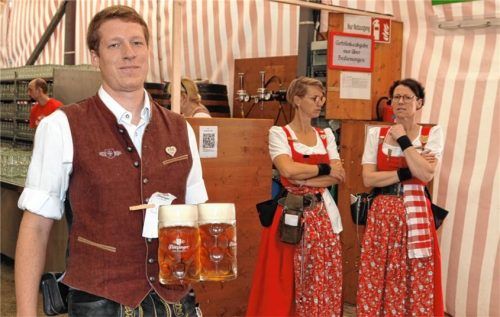 Historische Wiesn-Premiere: Das erste Mal überhaupt in 161 Jahren Herbstfest gibt es heuer im Flötzinger-Festzelt männliche Kellner. Die zwei Mass auf unserem Bild schafft Alexander Gsinn mit links, aber da geht sicher noch viel mehr. Auch die fesche Tracht kann sich sehen lassen. Damit geben die Fl