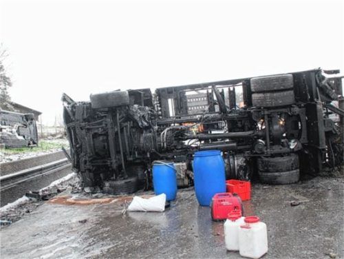 Autotransporter auf schneebedeckter Fahrbahn am Bernauer Berg verunglückt