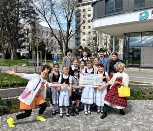 Die Kindergruppe des Trachtenvereins Steinhöring sammelte beim Klopfersingen 800 Euro für die Klinikclowns. Die Mädchen und Buben trafen nun „Pomodoro“ und „Lulu“ vor dem Romed-Klinikum in Rosenheim und überreichten die Spende. Seit vielen Jahren besuchen die Faxenmacher vom Verein Klinikclowns Baye