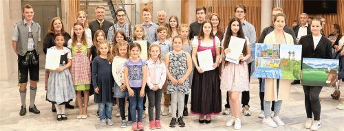 Elf Preisträger des Wettbewerbs „Heimat erleben“ haben Landrat Otto Lederer (hinten links) und Kulturreferent Christoph Maier-Gehring (hinten Mitte) ausgezeichnet. Einen ersten Preis und 500 Euro verdienten sich in der Kategorie Gruppenarbeit bei den Grund- und Förderschulen die Klassen 2a und 2b de