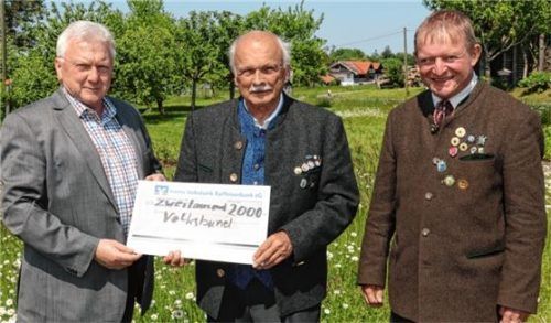 2000 Euro übergaben der Obmann der Interessengemeinschaft der Krieger- und Veteranenvereine und Soldatenkameradschaften im Landkreis Rosenheim, Pius Graf (links), und Schatzmeister Peter Gartner (rechts) an den Ehrenvorsitzenden des Bezirksverbands Oberbayern im Volksbund Deutsche Kriegsgräberfürsor