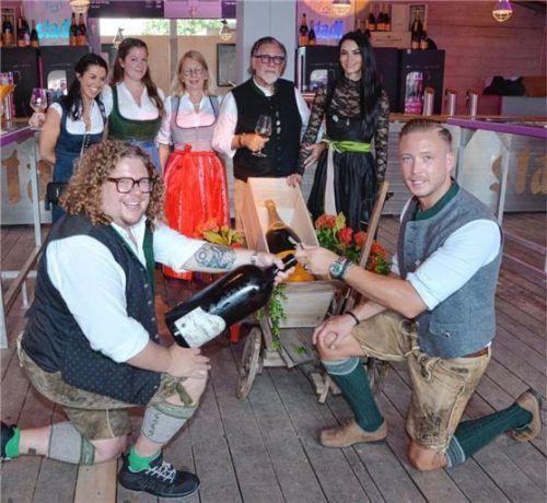 Hier gehen Max Fraenkel und Franz Stettner vom Proseccostadl zwar für einen Ritterschlag in die Knie, aber ein festes Wiesn-Ritual ist der Stereo-Kniefall trotzdem. Schließlich ist das feierliche Köpfen der ersten Proseccoflasche inzwischen ein Akt, der seit 34 Jahren fest dazu gehört auf dem Herbst
