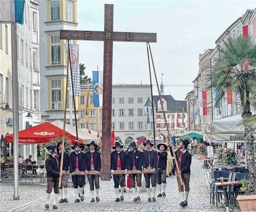Schwer beeindruckt hat den Wiesnigel Ignaz beim Erntedank das Erler Kreuz: Fünfeinhalb Meter hoch und rund 160 Kilo schwer ist das Glaubenszeugnis, das zehn gestandene Mannsbilder schwer beschäftigt hat: Sechs Männer trugen das Kreuz, vier stützten es auf dem Weg vom Max-Josefs-Platz zum Altar am Ma