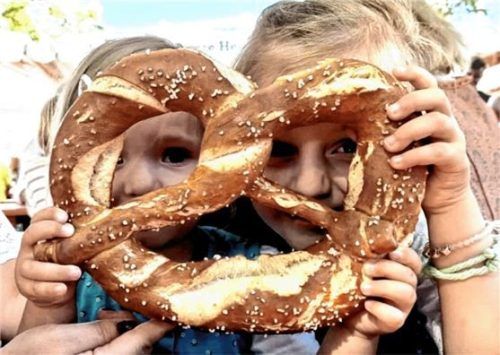Einfach riesig! Brezn im XXL-Format haben es vielen Buben und Mädchen auf der Wiesn angetan. Hier haben Hannah und Helena, zwei und fünf Jahre, aus Großkarolinenfeld den Durchblick. Und was mögen sie sonst noch so? „Im Riesenrad und im Karussell im Feuerwehrauto fahren.“ Foto re