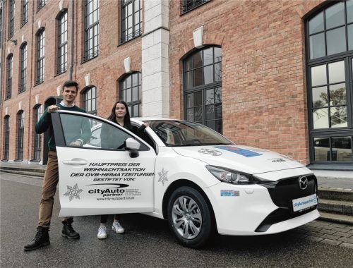 Auf der Fahrertür steht es schwarz auf weiß: Dieser Mazda ist der Hauptpreis der Weihnachtsaktion „OVB-Leser zeigen Herz“. Rund 18000 Euro ist er wert – und wer den Wagen, gestiftet von der City-Autopartner GmbH Kolbermoor (ein Unternehmen der Auto-Eder-Gruppe), gewinnen will, der muss gar nicht vie