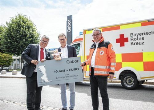 Die Gabor Shoes AG spendet 10428 Euro an das Bayerische Rote Kreuz. Gabor-Chef Stefan Blöchinger (Mitte) übergab den Scheck an Martin Schmidt (links), Kreisgeschäftsführer des BRK Rosenheim, und an Thomas Neugebauer, Leiter Rettungsdienst. Während der Flut, die im Juni auch den Landkreis stark betro