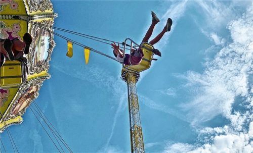 Im Sitz vom Kettenkarussell Wellenflug direkt runter vom 85 Meter hohen Freifallturm Hangover? Sieht fast so aus auf dem Rosenheimer Herbstfest, aber das ist wie so oft nur eine Frage der Perspektive und des Augenblicks. Das Kind im Karussell dreht sich weiter im Kreis, die Menschen im Turm fallen M