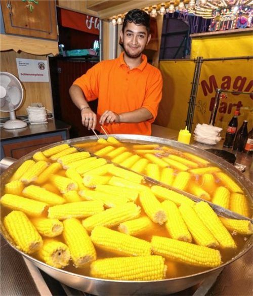 Da hat einer etwas auf der Pfanne. Sicherlich eine der größten Bratpfannen auf dem Rosenheimer Herbstfest findet man bei „Branicki´s Schlemmerhäusl“ gegenüber der Auerbräu-Festhalle. Der Mais ist übrigens ein Einwanderer in Europa. Ursprünglich stammen die gelben Kolben aus Mexiko. Dort gab es sie s