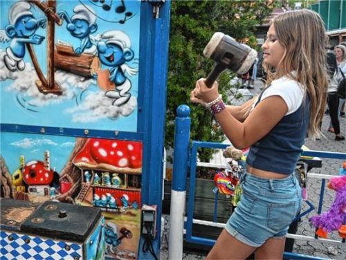Der „Hau den Lukas“ gehört zur Wiesn wie das Riesenrad oder der Autoscooter. So mancher Maulheld und Möchtegern-Kraftlackel hat sich dort schon blamiert. Nicht so die elfjährige Isabella Burghardt aus Rott am Inn, die hier mit eher zarter Hand den Hammer schwingt. Um Schlagkraft ging es ihr ja auch