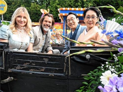 Die Wiesn verbindet Welten: Normalerweise liegen fast 13000 Flugkilometer zwischen Ichikawas Bürgermeister Koh Tanaka und Ehefrau Mika sowie Sylvie und Tobias Tomczyk (stellvertretender WV-Vorsitzender) – doch hier sitzen sie eng zusammen in der Kutsche des Wirtschaftlichen Verbandes. Seit 20 Jahren