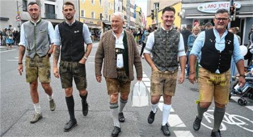 Eine Wiesn, drei Generationen, fünf Lederhosen: Leicht zu erraten, welches Ziel das Rosenheimer Urgestein Helmut Klinger aus der Kastenau (Mitte) samt Enkeln Denis, Mario und Patrick sowie Sohn Helmut junior (von links) ansteuert. Foto ruprecht