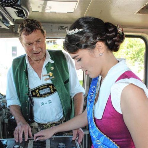 Historisch, nostalgisch, sicher: Das ist der Wiesn-Express, der an Herbstfesttagen wie diesen Rohrdorf, Thansau und Rosenheim verbindet – auf einer ansonsten nur für den Güterverkehr offenen Strecke. Miss Herbstfest Eva Maria Bachmaier lässt sich hier von Wiesn-Express-Initiator Helmut Wiesböck am F