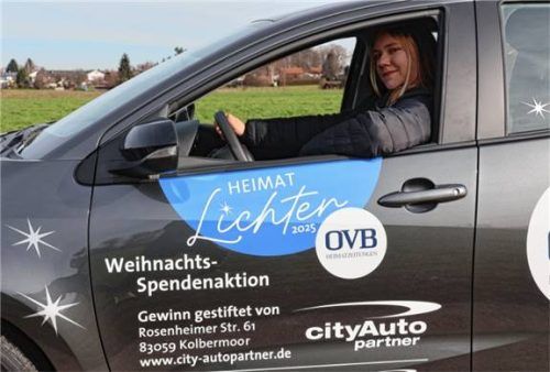 Lea Pfaffelhuber, Auszubildende im Büromanagement bei City-Autopartner Kolbermoor, fühlt sich sichtlich wohl im „Cockpit“ des Mazda 2 Hybrid, den es bei der OVB-Weihnachtsspendenaktion unter der Dachmarke HeimatLichter zu gewinnen gibt. Das Auto im Wert von 25000 Euro hat erneut City-Autopartner Kol