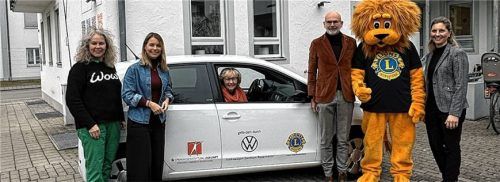 Groß war die Freude bei den Spendern und Sponsoren, die dem Kinderschutzbund die Anschaffung eines weiteren Dienstfahrzeugs ermöglichten: Thomas Möller (Dritter von rechts), Präsident des Lions Clubs Rosenheim, der sogar das lebensgroße Lions-Maskottchen (Florian Reichelt, Vorsitzender Lions Jugendf