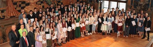 Herausragende Absolventinnen und Absolventen der vier Berufsschulen im Landkreis Rosenheim sind kürzlich im Rahmen einer feierlichen Zeremonie im historischen Rathaussaal der Stadt Wasserburg am Inn geehrt worden (unser Bild). Eingeladen waren die besten Staatspreisträger ihres Jahrgangs. Die Mehrhe