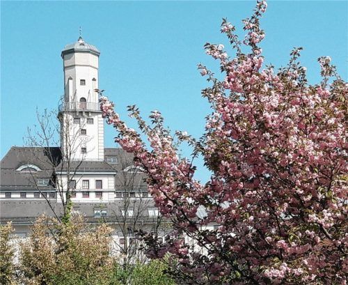Im Farbenrausch befindet sich derzeit die Stadt Rosenheim. Überall blühen die Bäume – auch hier am Mangfallkanal an der Kunstmühle, fotografiert aus einem ungewöhnlichen Blickwinkel. Bunte Blüten vor weiß-blauem Himmel: Das macht sich gut. Bei Stadtführungen bietet sich vom Turm der Kunstmühle eine