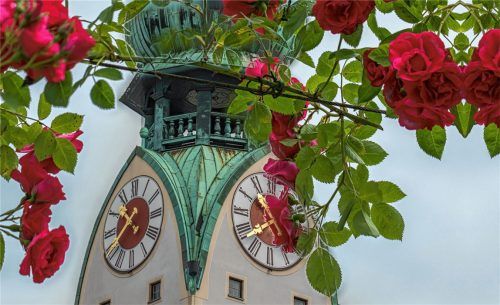 Die Rosen im Riedergarten sind nicht zu übersehen, aber wer findet die Rose des Rosenheimer Stadtwappens? Unsere Fotografin tut sich – anders als die Passanten in der Fußgängerzone – leicht, denn durch die Linse ihres Fotoapparats kann sie die Rosen heranzoomen. Sie zeigen sich an der Decke des Turm