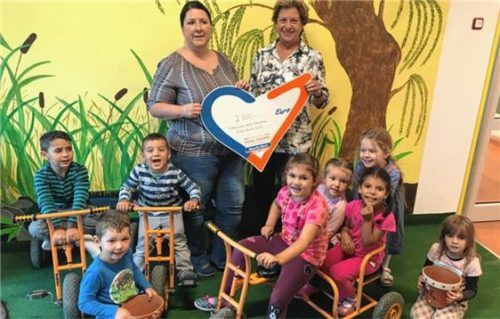 Dank der 2500-Euro-Spende des Gewinnsparvereins der Sparda-Bank München freute sich die Kindertagesstätte „Haus für Kinder Villa Kunterbunt“ des Diakonischen Werkes Rosenheim über die Anschaffung neuer Fahrzeuge. Diese probierten die Kinder im Beisein von Ulrike Blank (links) (Diakonisches Werk Rose