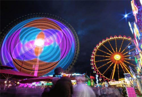 Einen künstlerischen Beitrag für unsere Reihe der Wiesn-Schnappschüsse hat Heinz Zimmermann aus Rosenheim geliefert: eine Langzeit-Belichtung (vier Sekunden) von den beiden Fahrgeschäften V-Maxx und Riesenrad. Das Ergebnis ist eine Veröffentlichung wert: Es entsteht ein faszinierendes Muster, das mi