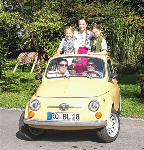 „So griagd ma leichter an Parkplatz!“, finden Familie Eichhorn (Tanja mit Paula) und Familie Königbauer (Karin mit Maxi und Sophia), die mit ihrem alten Fiat 500 zur Wiesn fahren. Eine gute Idee, die Karin Königbauer aus Neubeuern in diesem Wiesnschnappschuss festgehalten hat. Dafür gibt es ein letz