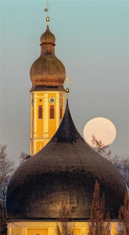 Auch der Vollmond scheint an den Rundungen der Kirche St. Johann Baptist und Heilig Kreuz in Westerndorf am Wasen Gefallen zu finden. Und rollt mal eben hinunter zum Horizont, um der aufsteigenden Morgensonne zu weichen – schreibt Martina Stephan zu ihrer wunderbaren, morgendlichen Aufnahme.Foto Ste