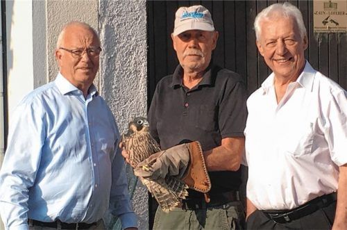 Retter in Not: Toni Sket, Gastwirt des Wirtshauses „Zum Johann Auer“, entdeckte am Montagmorgen auf dem Weg ins Lokal ein junges Wanderfalkenweibchen. Der Ausreißer konnte noch nicht selbstständig fliegen, irrte erst auf der Straße und später auf dem Sims über dem Stadtbach umher. Sket (Bild rechts)
