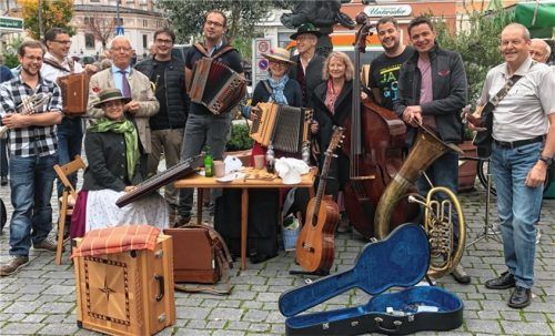 Gute Musik gab es beim Kirtasamstag auf dem Grünen Markt in Rosenheim. Die „Schafewoad-Musi“ unter der Leitung von Monika Fackeldey spielte traditionelle Stücke mit einer persönlichen Note. Spontan gesellte sich zu dem Auftritt auch die Gruppe „Karnischer Klang“ dazu, die sich gerade in Rosenheim au