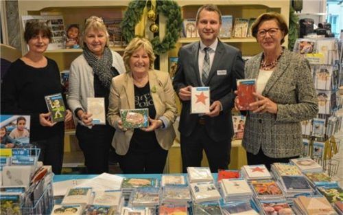 Bis 21. Dezember werden Unicef-Weihnachtskarten im Erdgeschoss der Galeria Karstadt Rosenheim verkauft – am letzten Tag tritt um 11 Uhr zudem der Jugendchor Fürstätt auf. Auf viele Kunden hoffen (von links) Iris Huber und Karen Koch von Unicef, Standleiterin Waltraud Weber, Jens Steinbrecher von Kar