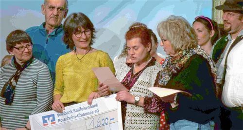 Zum Abschluss der letzten Theatervorstellung „A’s Glück is a Matz“ der Pflegerbühne im Theaterstadl Schechen wartete eine Überraschung auf die Abteilung Handicap-Integrativ des Sportbunds DJK Rosenheim: Die Vorsitzende des Theatervereins, Burgi Schaber (Zweite von links), überreichte einigen Sportle