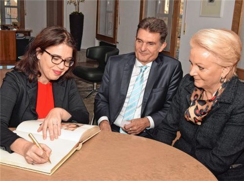 Die israelische Generalkonsulin Sandra Simovich (links) stattete der Stadt Rosenheim ihren offiziellen Antrittsbesuch ab. Im Rathaus wurde sie von Oberbürgermeisterin Gabriele Bauer und Stadtdirektor Michael Keneder empfangen. Dem Eintrag ins Goldene Buch der Stadt folgte ein gemeinsamer Gedankenaus