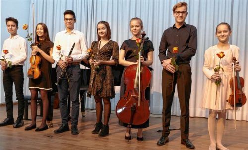 Mit Werken für Soloinstrumente und Klavier präsentierte sich die Talentförderklasse der Musikschule Rosenheim im Hans-Fischer-Saal des Künstlerhofes dem Publikum, das die Leistungen der sieben Vorzeigeschüler (von links) Johannes Burkhart (Kontrabass), Isa Mithani (Violine), Tim Herberhold (Klarinet