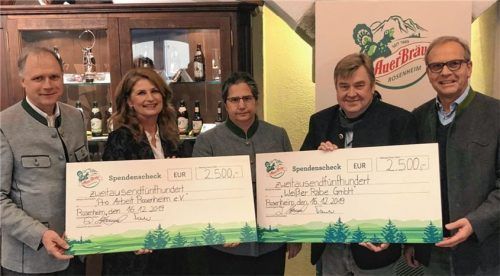 Gutes tun und Freude schenken: Zu Weihnachten spendet Auerbräu an Pro Arbeit Rosenheim und das Café im Klinikum (CiK). Die Auerbräu-Geschäftsführer Dirk Steinebach (rechts) und Thomas Frank (links) überreichten jetzt zwei Schecks mit jeweils 2500 Euro Spendengeldern an die beiden Einrichtungen. Zwec