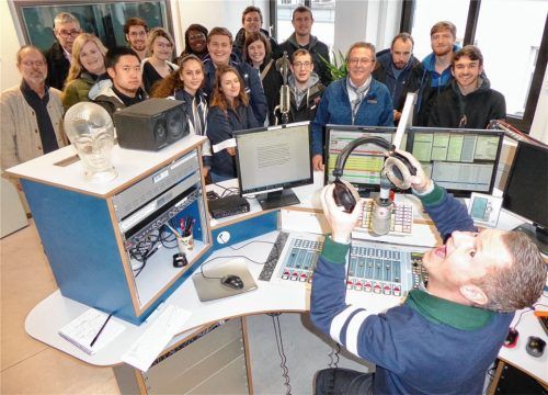 15 Studenten aus der „Rosenstadt“ Cape Girardeau in Missouri haben Radio Charivari an der Hafnerstraße einen Besuch abgestattet. Im Studio erläuterte Moderator Christian Baab (vorne) die Arbeit fürs Radio. Und gab Tipps zum Reinhören: „,La Brass Banda‘ und ,Django S‘ aus Rosenheim“. Seit 1972 kommen