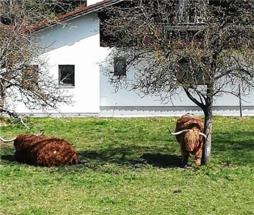 Diese Hochlandrinder auf einer Wiese bei Rosenheim halten den Corona-Abstand vorbildlich ein, wie Leserreporter Wolfgang Skolnik beobachtete. Die in ihrer Heimat Schottland Bo Gaidhealach genannten Tiere gelten als älteste registrierte Viehrasse überhaupt (1884). Foto Skolnik