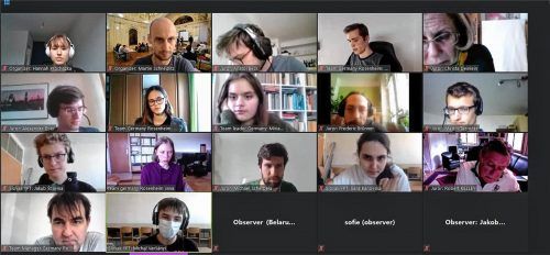 So sieht es aus, wenn ein internationaler Physikwettbewerb aufgrund der Corona-Krise virtuell ausgetragen werden muss. In einer Videokonferenz setzen sich zwei der acht Teams mit ihren Forschungsarbeiten auseinander, die sie bei dem Wettbewerb „Austrian Young Physicisits‘ Tornament“ (AYPT) eingereic
