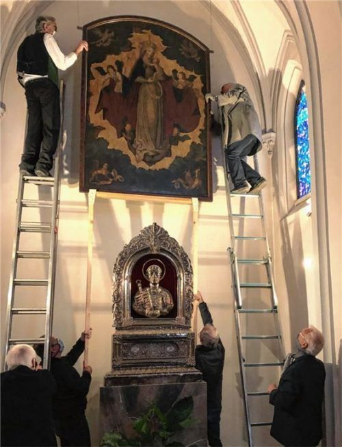 In den Marienmonaten von Mai bis Oktober zeigt die doppelseitig bemalte spätgotische Tafel von 1515 die Seite der Schutzmantelmadonna mit den Symbolen der vier Evangelisten in den Bildecken. Das Bild ist eines der wenigen Kunstwerke gotischer Kunst, das beim Stadtbrand 1641 in der Kapelle Sankt Mich