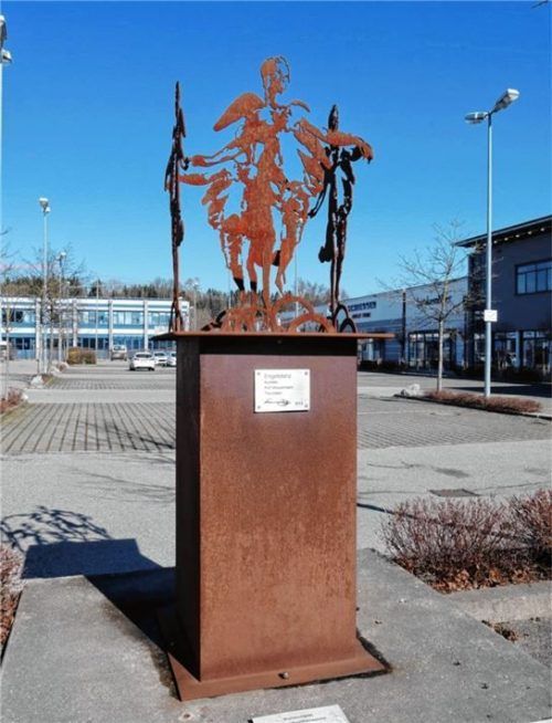 Rosenheim – Ein Engelsreigen bringt im Aicherpark einen Hauch von Kunst zwischen die zahlreichen Geschäfte und Parkplätze. Vier rostbraune Engel, aus Cortenstahl mit dem Laser geschnitten, reichen sich auf einem hohen Sockel die Hände, tanzen leichtfüßig über angedeut