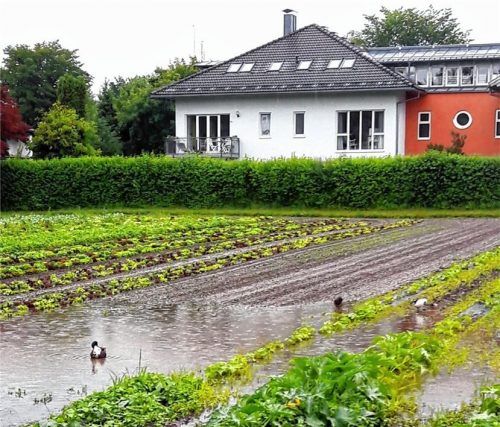 Da haben wir den Salat, Paula! Zumindest muss ihn unsere Wetterente bei den derzeit ergiebigen Regenfällen nicht mehr waschen, wenn sie das Grünzeug aus dem Selbstbedienungs-Feld an der Austraße kurz vor der Kirche St. Hedwig schnabulieren möchte.Foto Heuser