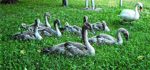 Unserem Leser-Reporter Lothar Schultz-Pernice aus Rosenheim gelang dieses Foto: Das Schwanenpaar, das seit Jahren oberhalb der Münchener Straße auf einer Insel im Mangfallkanal brütet, machte mit allen sieben Jungschwänen einen Familienausflug in die GRWS-Siedlung in der Endorferau. Dort grasten die