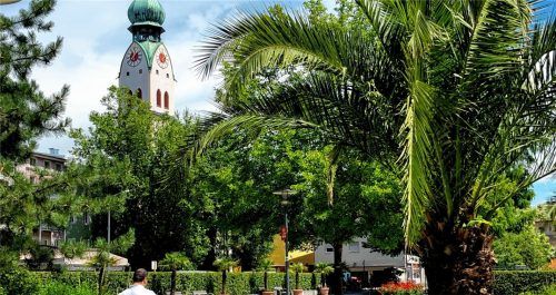 Dieser Anblick muss wohl Urlaubsgefühle hervorrufen: blauer Himmel, Sonne pur und Palmen in Rosenheim. Das Foto ist im Riedergarten entstanden. Wer heuer wegen der Corona-Pandemie nicht in den Urlaub fahren kann oder möchte, der genießt den Sommer einfach in einem von Rosenheims zahlreichen Parks. D