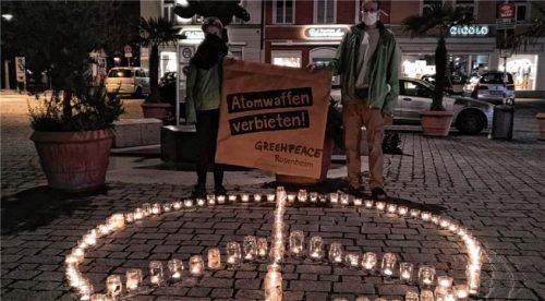 In Erinnerung an den Atombombenabwurf auf die japanische Stadt Hiroshima vor 75 Jahren haben Greenpeace-Ehrenamtliche in ganz Deutschland „Peace“-Zeichen aus Kerzen aufgestellt. Auch die Ehrenamtlichen aus Rosenheim entzündete auf dem Ludwigsplatz Friedenslichter, um der damaligen Katastrophe zu ged