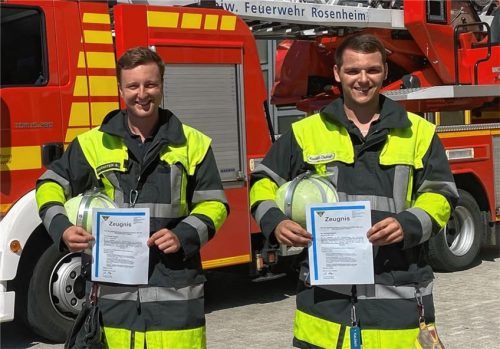 Die Feuerwehr der Stadt Rosenheim freut sich über ihren Erfolg: Sebastian Hauenstein (links) und Christoph Kaulisch haben den Lehrgang zum Brandmeister und Rettungssanitäter mit dem ersten und zweiten Platz der Lehrgangsbesten in ganz Bayern abgeschlossen. Lob gab es von Stadtbrandrat Hans Meyrl und